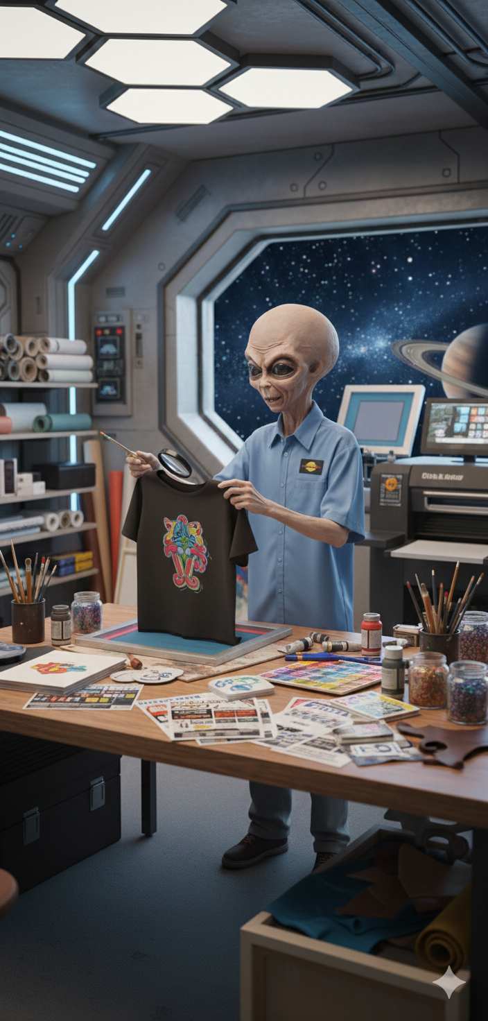 Convertimos ideas terrestres en impresiones galácticas. Papel, textil y merchandising con calidad extraterrestre.